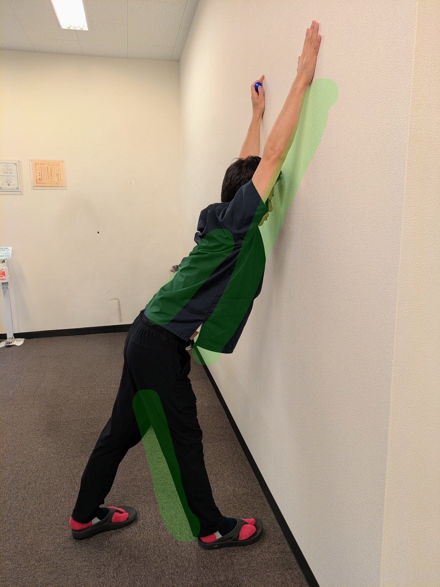☆壁ストレッチ☆「デスクワーク中に肩が重いときに1分でできるリセット法」写真のポーズから体重を下に掛けてストレッチをかけます。 30秒やったら足を入れ替えて30秒!・手をめいいっぱい開く